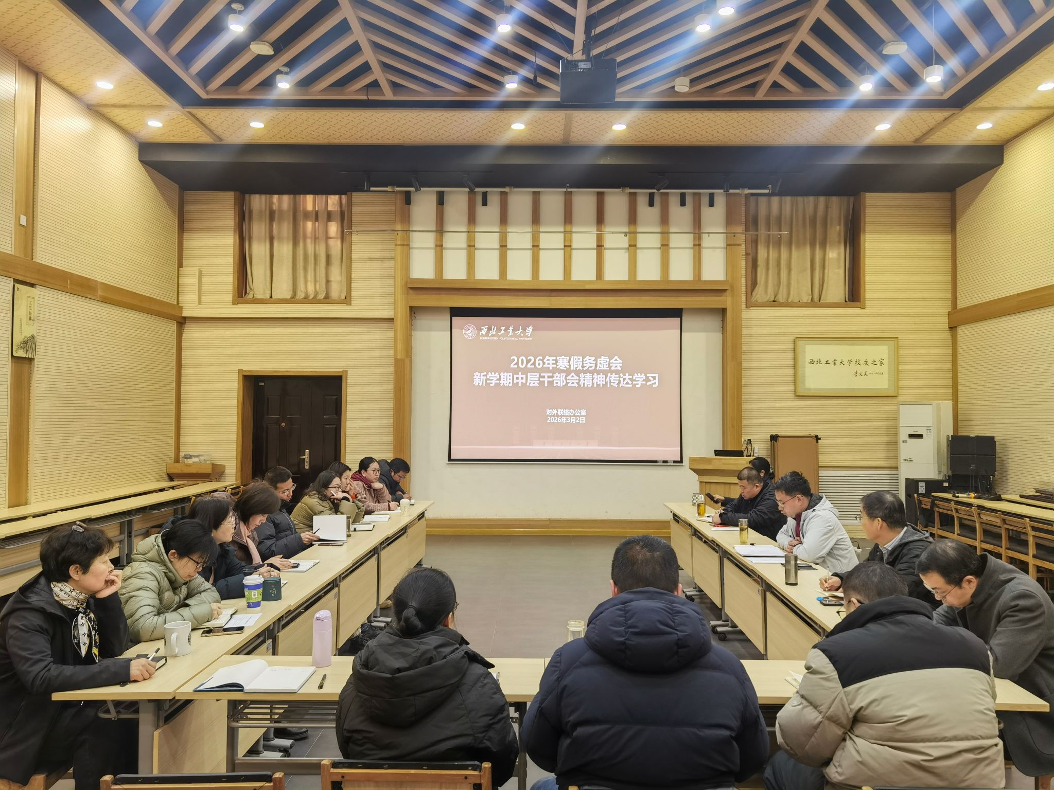 3月2日,对外联络办公室组织全体工作人员召开专题学习会,深入学习领会学校2026年寒假务虚会及新学期中层干部会议精神,重点传达学习学校党委书记李言荣、校长宋保维的讲话要求。