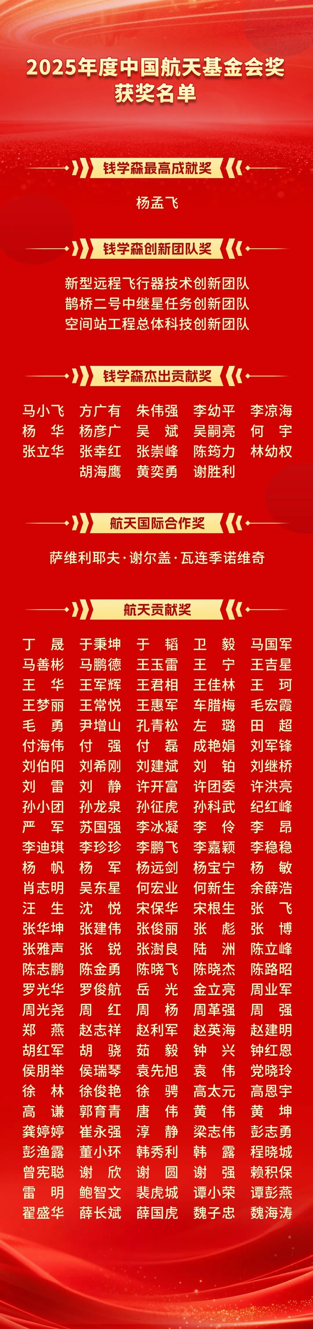 在表彰名单中,中国科学院院士、探月三期探测器系统总设计师和总指挥杨孟飞获得“钱学森最高成就奖”;空间站工程总体科技创新团队等3个团队获得“钱学森创新团队奖”;18名个人获得“钱学森杰出贡献奖”;俄罗斯国家航天集团公司副总经理萨维利耶夫·谢尔盖·瓦连季诺维奇获“航天国际合作奖”;145名个人获得“航天贡献奖”。